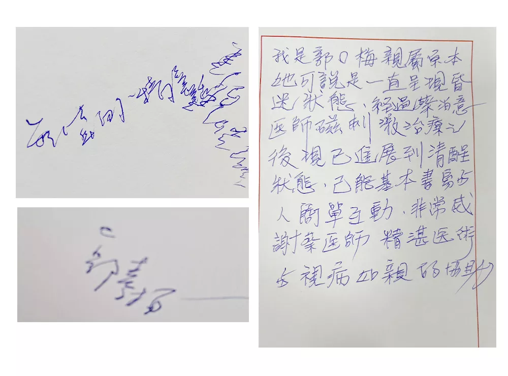 在接受15次治療後,郭女士居然會與家人溝通了,可以用手拿筆寫字,寫出來自己的名字以及不少文字!