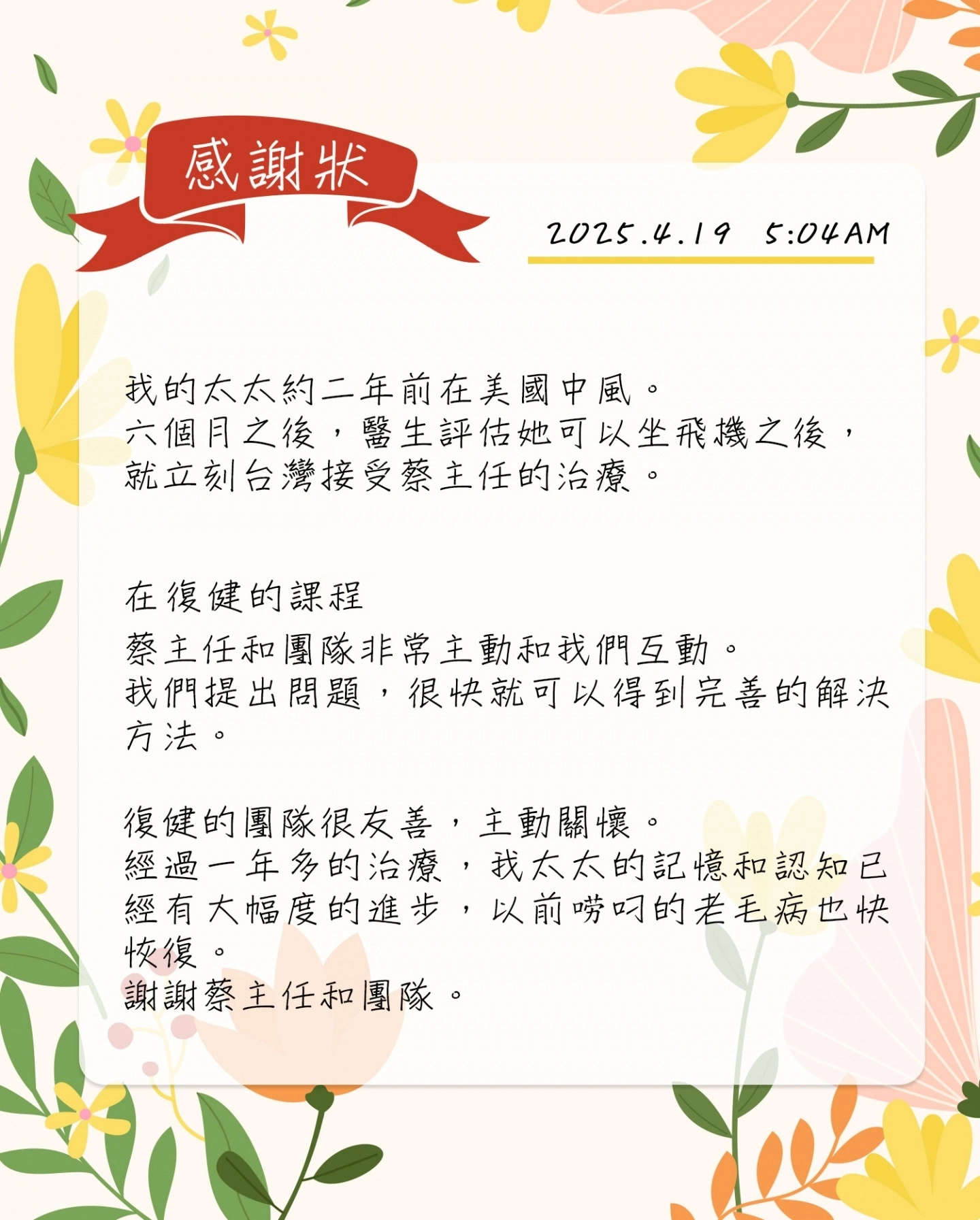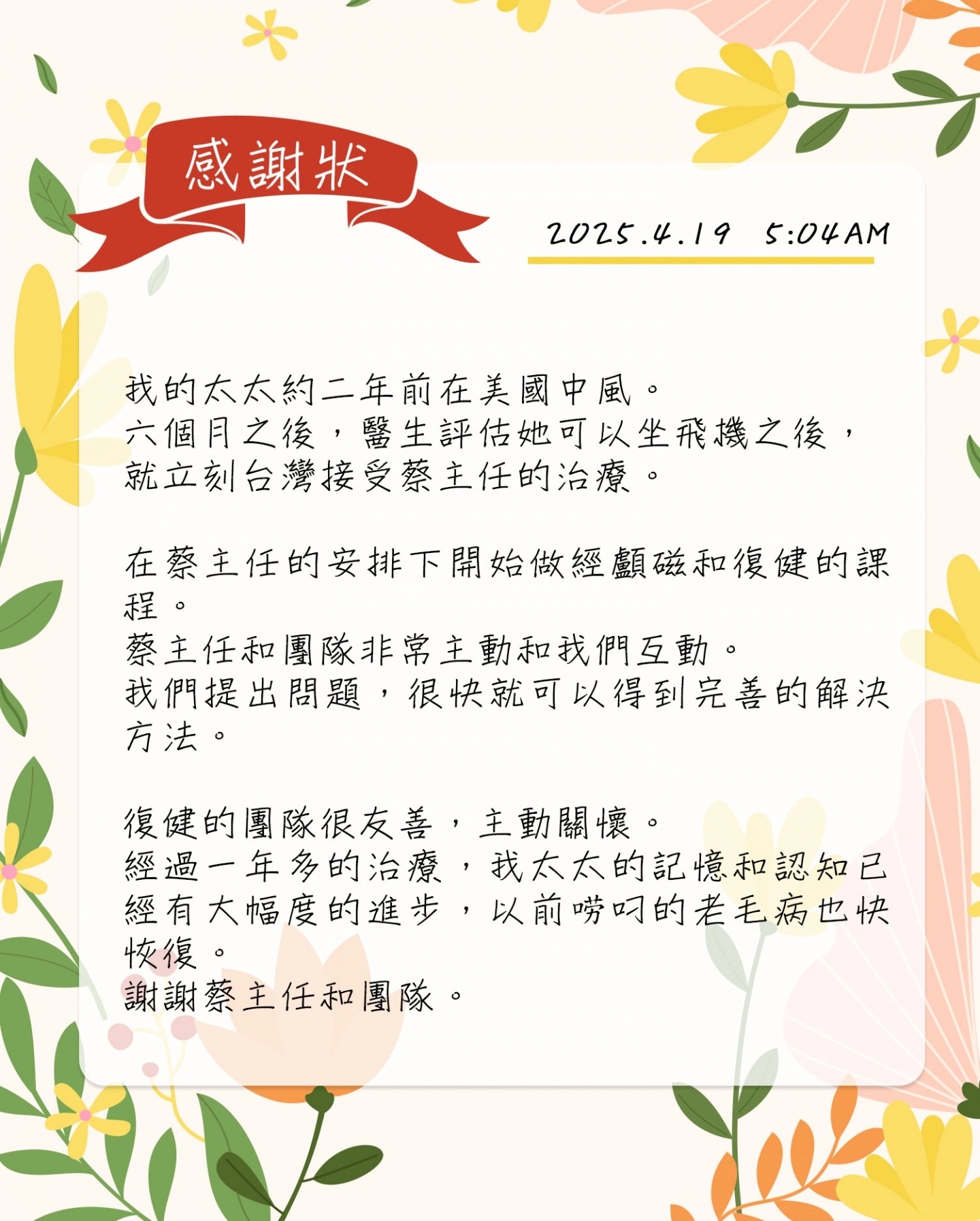- 恢復狀況可獨自生活,外出購物,頭暈改善,尤其認知、記憶力改善。